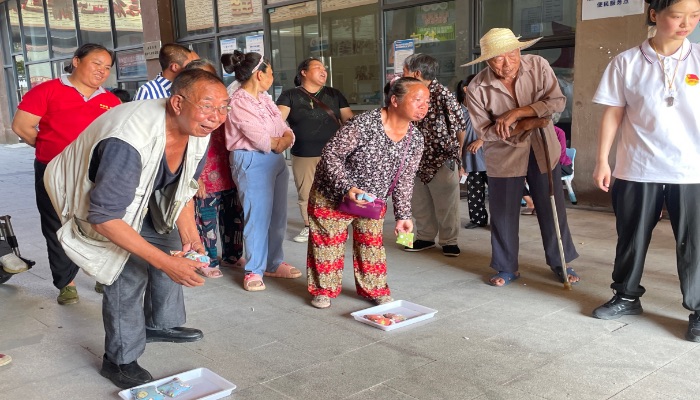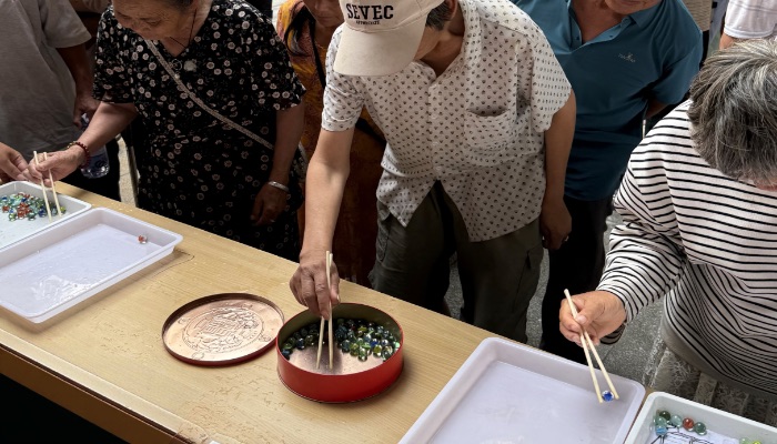 “跳動玻璃球”考驗手部靈活性,過程中老人和殘障居民都能在其中獲得自我突破,趣味橫生的場面引得圍觀居民笑聲連連。