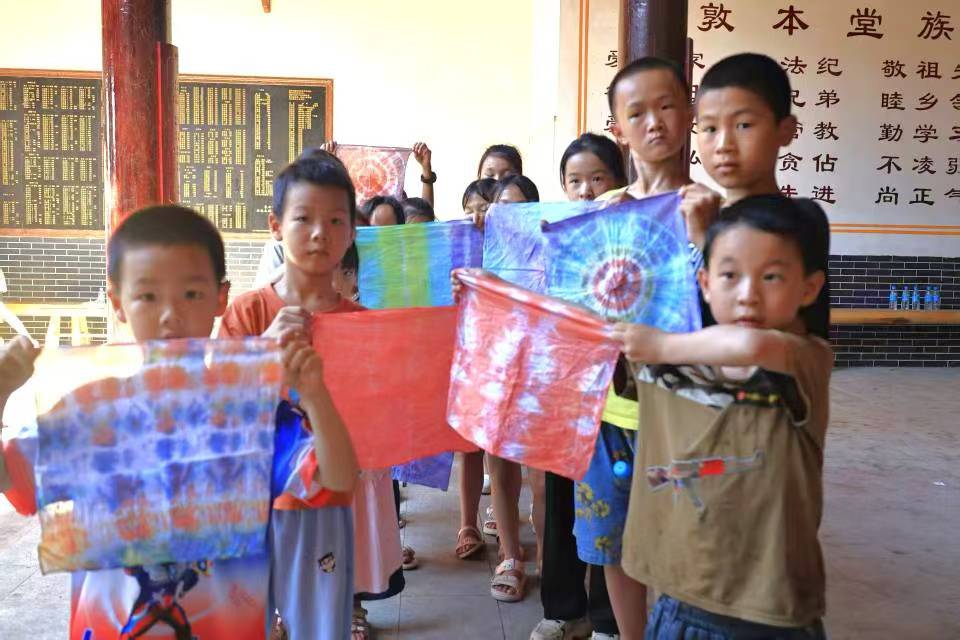 志愿者們以匠心傳承文化,在小小課堂里鋪展非遺畫卷。孩子們執筆描繪京劇臉譜,在紅黃藍白間讀懂忠勇信義;素手扎染藍白布匹,看板藍根汁液在棉布上暈染千年智慧;落葉拼貼間重構鄉土記憶,翰墨書香里傳承文化根脈。當一張張繪滿童真的臉譜被高高舉起,當扎染布匹在陽光下泛著幽藍光澤,傳統文化的光彩與鄉村振興的希望,在這方小小講臺悄然交匯,生生不息。