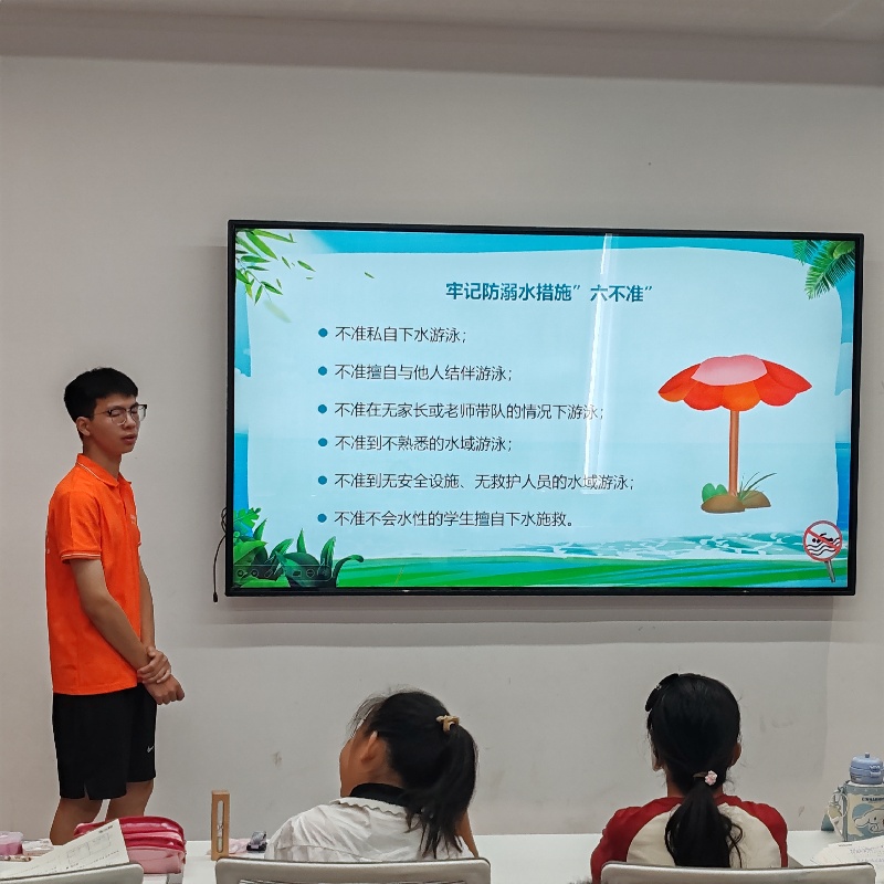 暑期是溺水事故高發(fā)期,筑牢安全防線刻不容緩。“游泳前的熱身怎么做?”“遇到小伙伴溺水,我們能直接跳下去救嗎?”團隊成員李德旺帶來的游泳安全知識課堂,沒有枯燥的說教,而是通過貼近生活的場景、互動問答的形式展開。他從熱身動作示范講到正規(guī)泳池的選擇,從遭遇抽筋的自救方法到如何智慧呼救與互救,內(nèi)容詳實且極具操作性。孩子們踴躍舉手參與互動,在輕松的氛圍中將“安全第一”的種子深深植入心田。