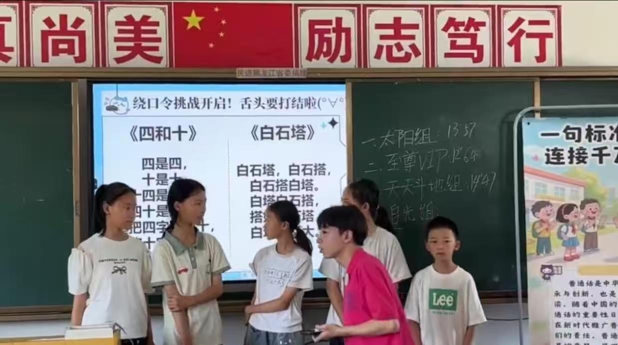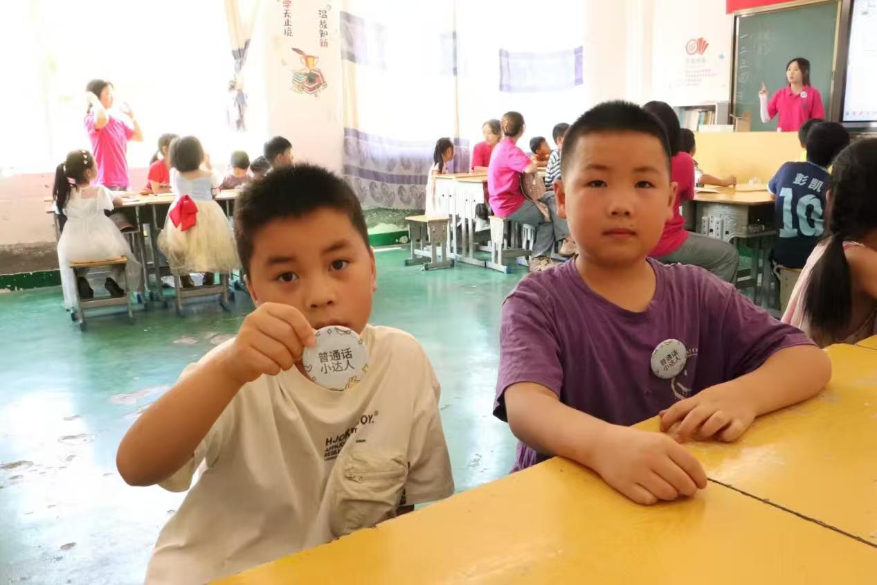 普通話課堂上,志愿者們巧妙融入孩子們喜愛的IP形象串聯知識點。在緊張有趣的繞口令挑戰環節,“四和十,十和四……”的練習讓不少孩子饒舌打結,稚嫩的聲音引發陣陣歡笑,也令發音練習格外深刻。課程尾聲的“普通話小達人”認證環節將氣氛推向高潮。手捧認證卡片,三年級學生王鑫偉興奮地說:“我要當推普小明星,回去教爺爺奶奶說普通話!”童言稚語,傳遞出孩子們推廣普通話的純真熱忱。