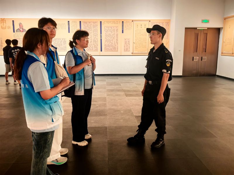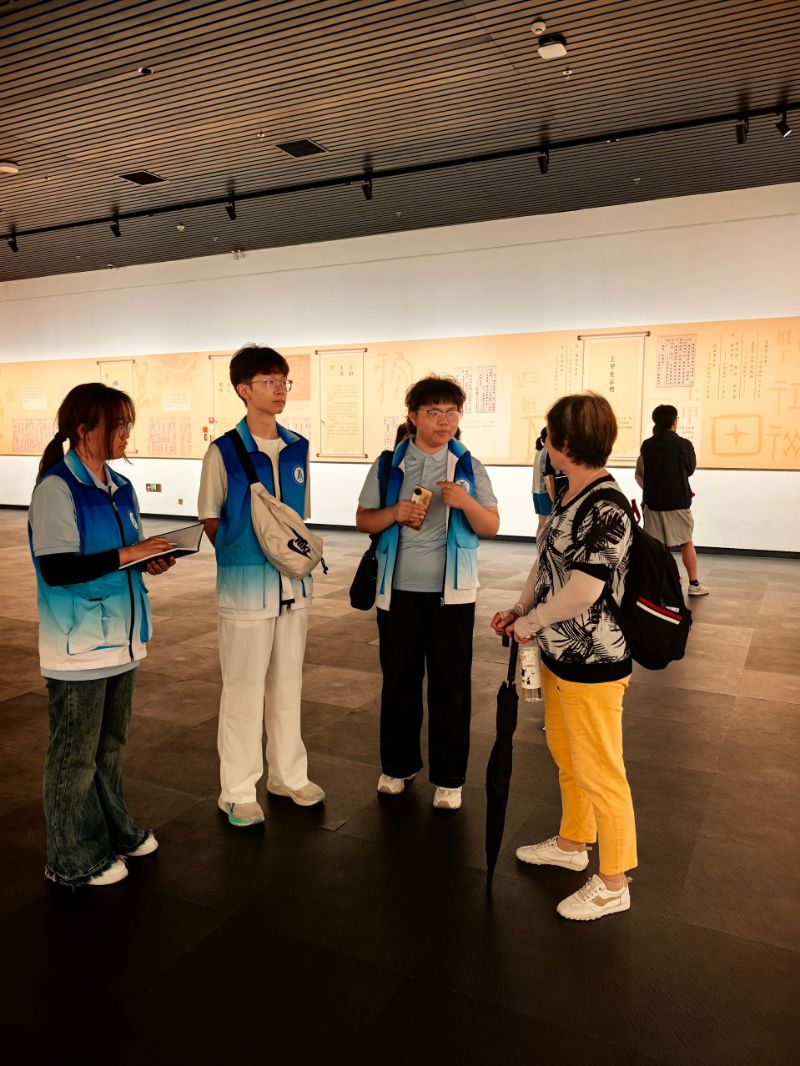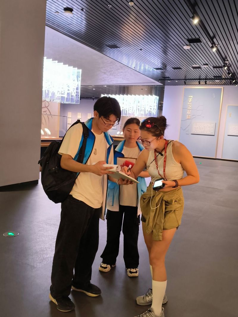 實踐隊首站抵達中國文字博物館。一進入展廳,巨大的仿刻甲骨片墻便引得同學們驚嘆連連。“這片商王武丁時期的卜辭,記載了最早的‘車禍’!”講解員指著“癸巳日,王乘馬車墜”的甲骨文,瞬間點燃了大家的興趣。隊員們圍在互動拓印臺前,親手用朱砂拓印甲骨文字,“福”“龍”等字符在宣紙上漸次浮現。在“文字的力量”沉浸展廳,光影動畫將甲骨文、金文到楷書的演變過程投射在穹頂,隊員們仰頭觀望,仿佛置身漢字長河。“文字是文明的‘活化石’,保護甲骨文不僅是守護歷史,更是為未來留存文化基因。正如習近平總書記強調的,要讓文物‘活起來’,我們需要用科技與創新賦予古老文字新的生命力。”文化遺產專業的隊員陳一凡在研學筆記中寫道。