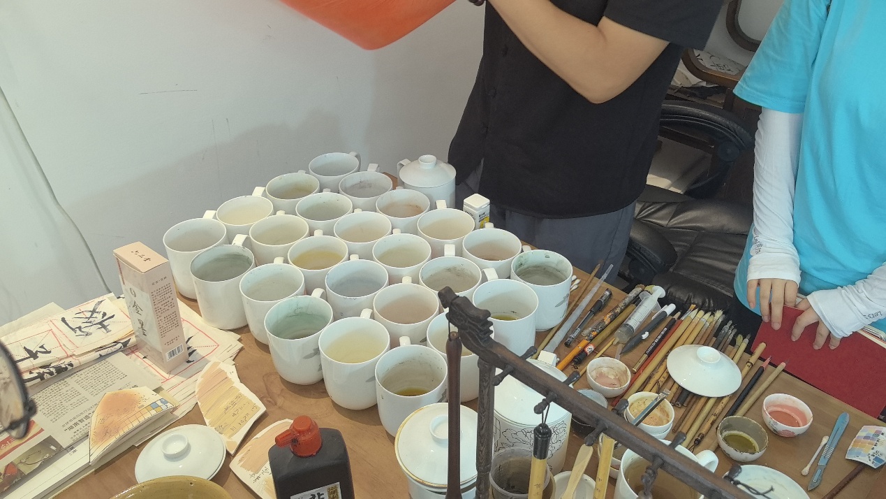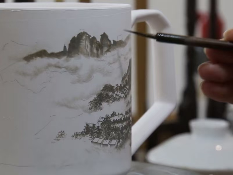 一件瓷器的誕生需歷經泥胚壓制、修胚、洗胚,上釉,素燒、釉下彩繪、噴釉、高溫燒制等復雜工序。“手工繪制的山水意境是靈魂所在。”楊志老師以呂洞山定制陶瓷杯為例,創作前需實地采風、研究苗族傳說,將“坐上觀云海,東籬舊菊花”的詩意凝于筆端。而成功率70%的精品背后,是嚴苛的品控——釉面若被指甲劃出微痕,燒成便會有瑕疵和劃痕;泥胚中的微小鐵屑需經多道磁選,否則燒成即現黑斑瑕疵。