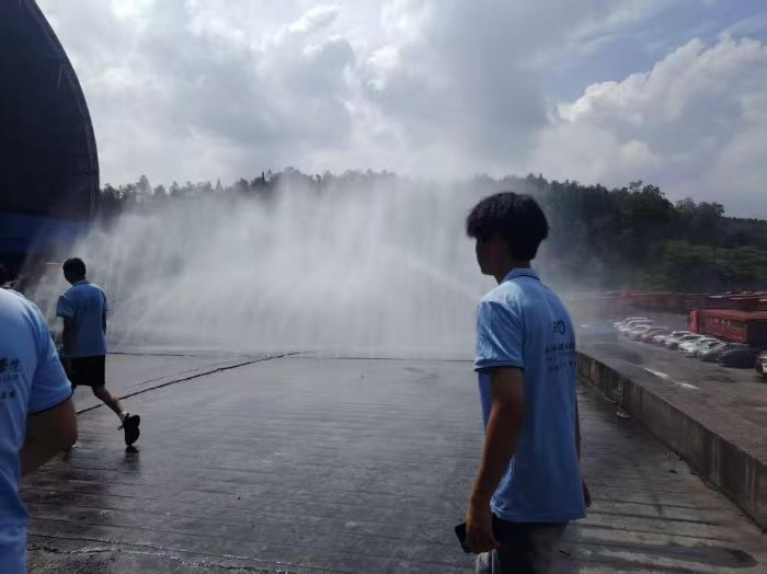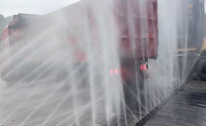 貴州文家壩礦業(yè)有限公司,卡車裝載好煤炭以后,出門下坡處裝設(shè)了噴水降塵裝置,使用循環(huán)水進行降塵,噴水系統(tǒng)一直噴水,不管是不是有卡車路過,除非在有人員經(jīng)過或者騎摩托車、電瓶車的時候,噴水系統(tǒng)才暫時關(guān)閉噴水。