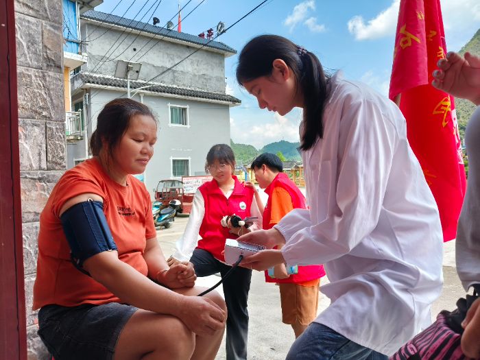 村社“實踐課”:健康義診傳遞溫暖政策宣講解碼團結密碼 7月7日至8日,實踐團走進建設村和堯棒村,創新“義診+宣講”模式開展活動。7日上午,建設村衛生室前排起長隊,實踐團設立“健康驛站”,為村民免費提供艾灸、按摩、血壓測量等服務。“您的血壓偏高,平時要少吃腌菜,飲食要清淡少鹽。”成員楊興宇一邊記錄數據一邊叮囑。駐村書記趙書記點贊道:“同學們下鄉義診傳遞黔醫精神,是民族團結最實在的體現,詮釋了新時代青年擔當。”