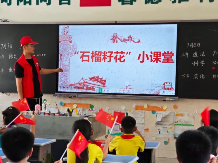 校園“石榴籽花課”:石榴籽花播撒童心團結種子生根發芽 7日下午在荔波二小,“石榴籽花”小課堂氣氛熱烈。實踐團成員正通過視頻展播帶領孩子們“云參觀”習近平總書記考察黎平縣肇興侗寨的場景。四年級學生莫同學舉手提問:“哥哥,為什么總書記要去看少數民族村寨。”成員李嗣宣回答:“因為56個民族就像56顆石榴籽啊,緊緊抱在一起才能更強大啊。”