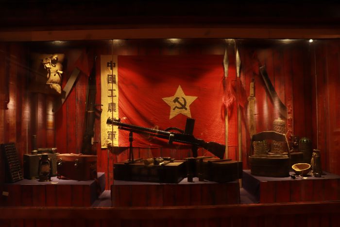 實踐隊首先來到板袍村陳列館,館內(nèi)陳列著紅軍長征時期的歷史照片和文獻(xiàn)資料等珍貴文物、,生動再現(xiàn)了紅三軍團(tuán)在鎮(zhèn)寧的戰(zhàn)斗歷程。1935年4月,紅軍長征途中,三軍團(tuán)十三團(tuán)急行軍于13日下午抵達(dá)江龍,大部分留在江龍及附近村寨修整,派出一支精干分隊佯攻鎮(zhèn)寧后折返江龍,這是抵鎮(zhèn)寧縣轄地的第一支紅軍部隊。