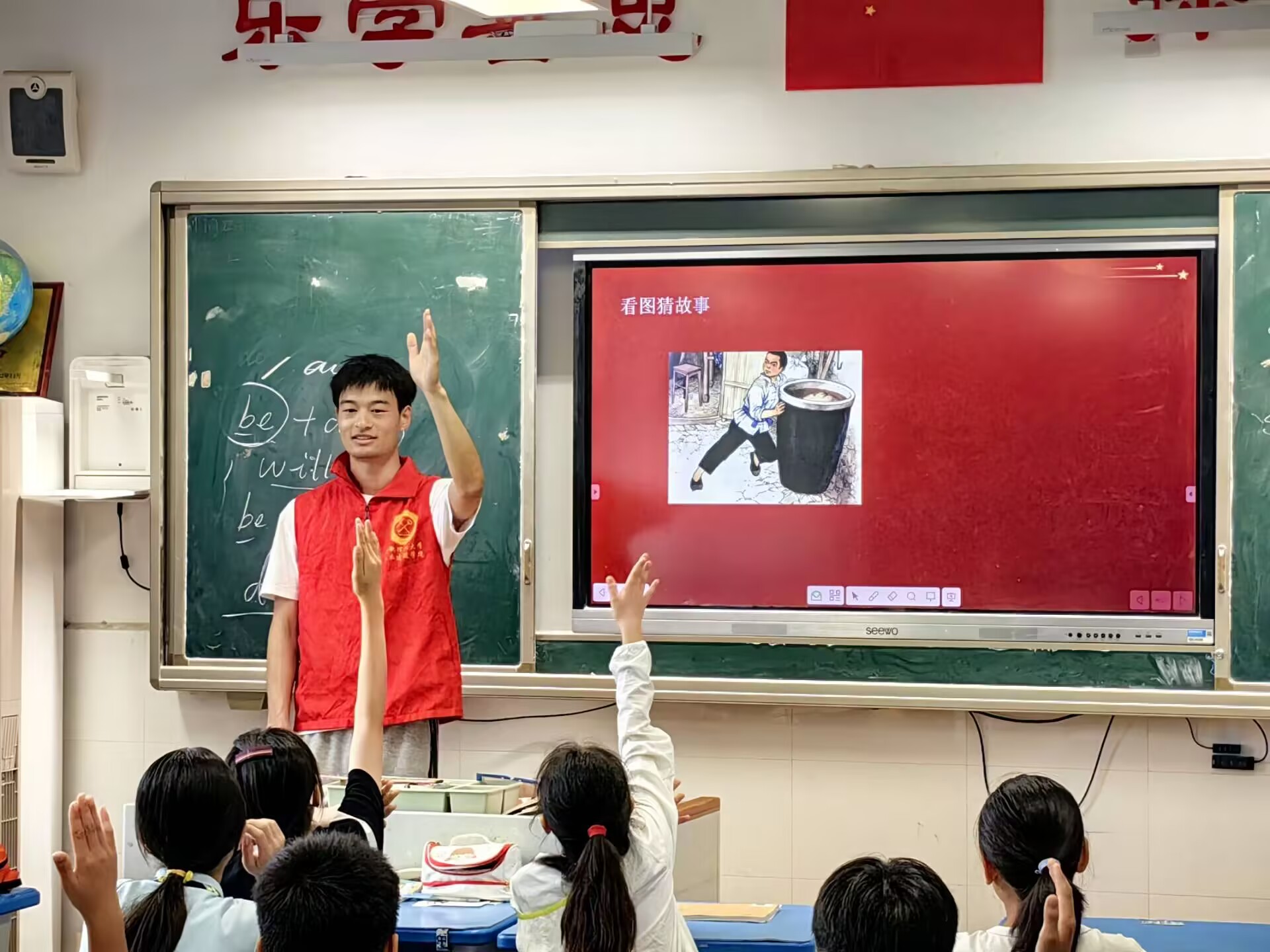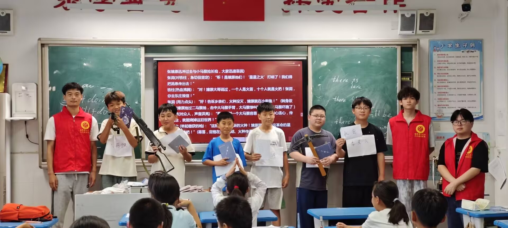 當(dāng)抗日小英雄王二小的圖片出現(xiàn)時(shí),孩子們的討論聲瞬間高漲。“他是放牛的小哥哥!”“他把壞蛋引到了陷阱里!”志愿者順勢(shì)講述王二小智斗敵人、犧牲自己保護(hù)鄉(xiāng)親的故事,原本喧鬧的教室漸漸安靜下來,孩子們的眼神里多了幾分敬佩。他們用稚嫩的聲音,讓在場(chǎng)的志愿者們感到自己的努力得到了回報(bào)。問答之間,不僅僅是對(duì)英雄人物的銘記,更是對(duì)紅色精神的傳承,在孩子們心中埋下了紅色的種子。