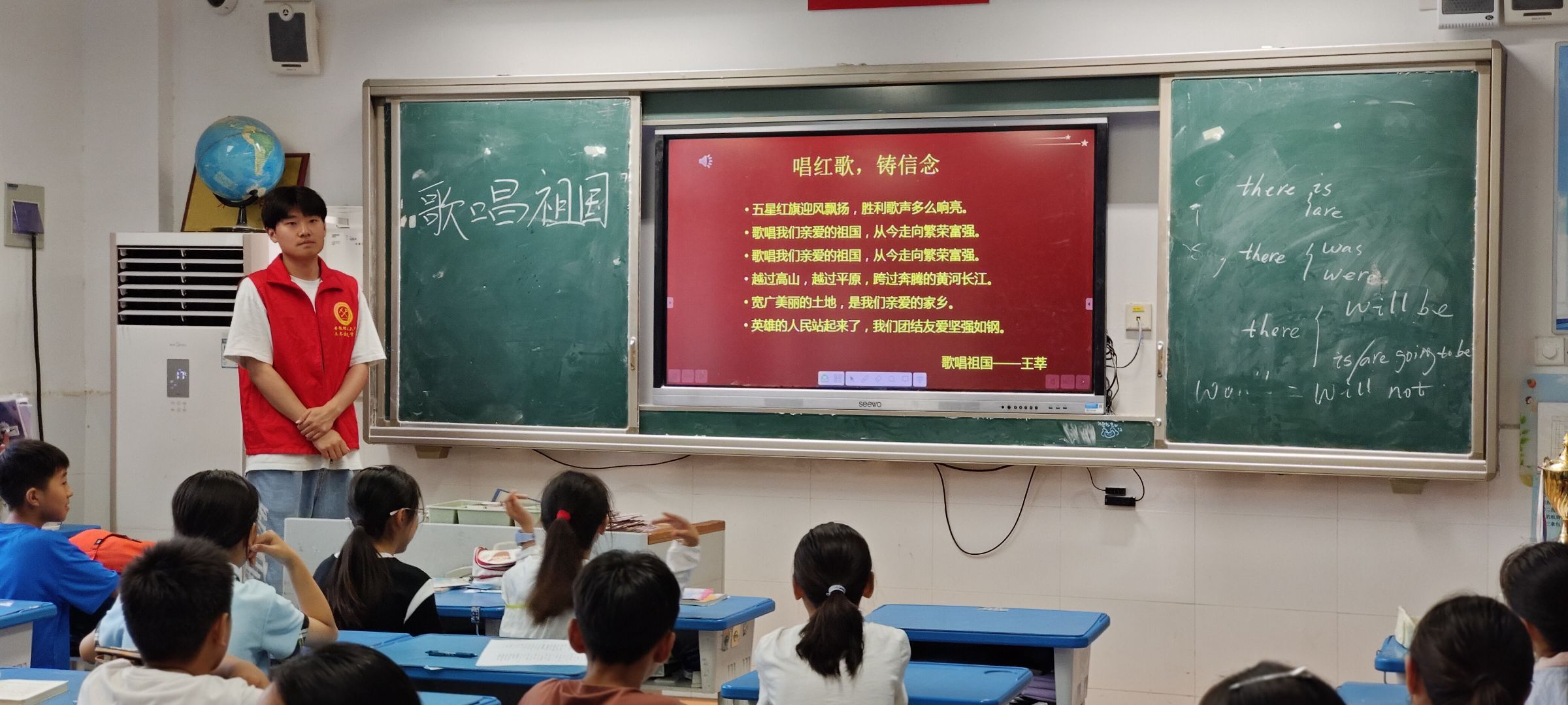 安徽理工大學(xué)附屬小學(xué)操場(chǎng)上,《歌唱祖國》的旋律響起,實(shí)踐隊(duì)員與學(xué)生們手持國旗列隊(duì)合唱,嘹亮歌聲傳遞著對(duì)祖國的赤誠熱愛。為讓孩子們更好地理解歌曲內(nèi)涵,團(tuán)隊(duì)特意在演唱前增加了“歌曲里的故事”環(huán)節(jié)。志愿者用簡(jiǎn)筆畫展示五星紅旗的樣子,告訴孩子們“為什么紅旗是紅色的”“五角星代表什么”,再結(jié)合歌詞講解“我們的祖國有多么強(qiáng)大”。