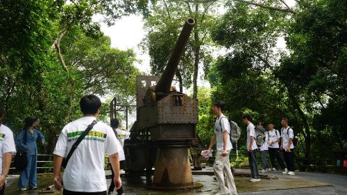 圖為實(shí)踐團(tuán)成員參觀援越抗美時(shí)期的克虜伯大炮(通訊員韋覃菲攝)