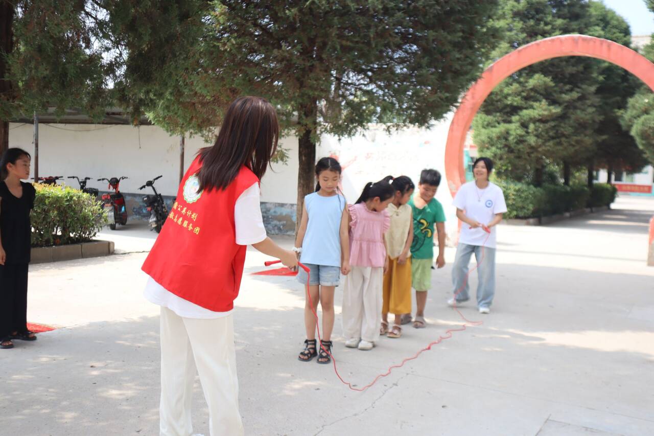 跳繩區域同樣熱鬧非凡,單人跳繩的孩子身輕如燕,快速地跳躍;雙人跳繩考驗著彼此的默契,兩人配合默契,繩子在空中快速飛舞;還有的孩子嘗試多人跳繩,大家齊心協力,笑聲回蕩在校園。支教老師和孩子們一起參與,現場氛圍十分活躍。支教團成員表示:“希望通過這些體育活動,讓孩子們在運動中增強體質,培養堅韌不拔的毅力和團隊合作精神,享受運動帶來的快樂。”
