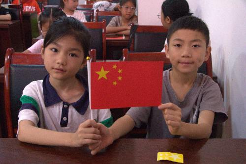 (圖為小朋友展示制作好的國旗照片。程坪攝)
