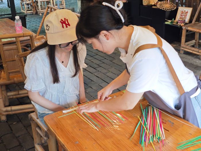 圖為實踐隊隊員在進行竹編技藝學(xué)習(xí)后進行討論與總結(jié)。羅嬌楊攝