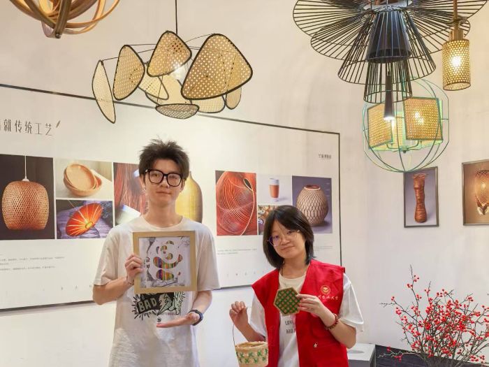 圖為實踐隊隊員制作的作品與新式竹編燈具的合影。羅嬌楊攝