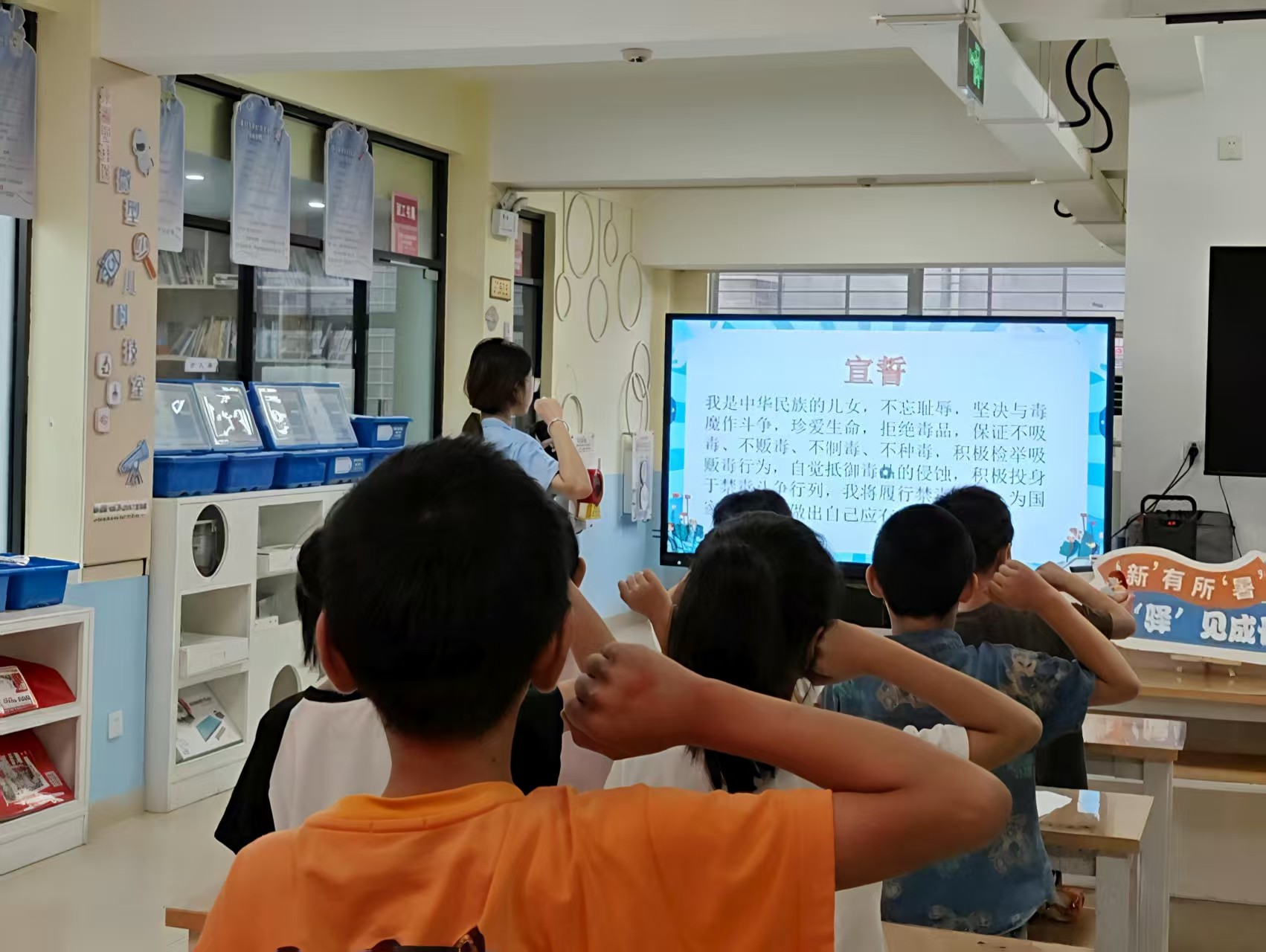 實踐隊在永福里社區新時代文明實踐站與青少年們一同開啟拒毒之旅。隊員們通過通俗易懂的講解和生動的案例視頻,詳細地講述了毒品的危害以及如何進行自我防御課堂上,通過“幻視眼鏡”“以畫拒毒”等寓教于樂的互動游戲,讓小朋友們在輕松愉快的氛圍中學習拒毒技能,增強自我保護意識,為青春生命筑起一道堅實的安全防線。