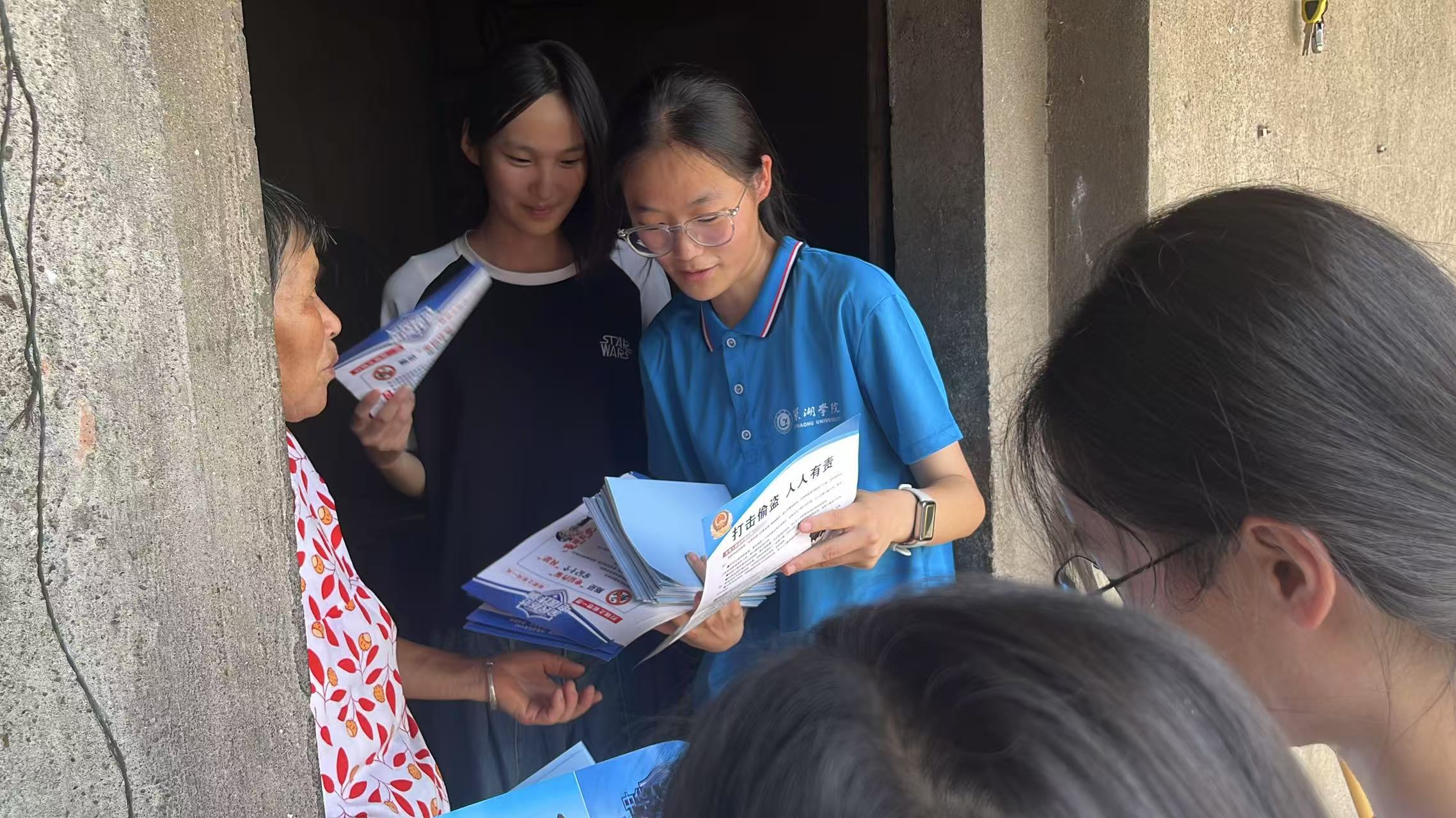 慰問活動不僅是一次精神的洗禮,也是實踐隊服務鄉村的延伸。在張世炳家及附近走訪時,隊員們結合近期農村多發的詐騙案例,向老人和周邊村民發放了精心準備的“打擊詐騙人人有責”宣傳手冊。“老人家,接到陌生電話讓轉賬或者說中獎了,千萬別信,要先跟子女或者村干部確認。”隊員李然天剛好是廬江縣本地人,很自然地用本地方言并耐心地向幾位圍攏過來的村民解釋常見的電信詐騙手段和防范要點。村民劉大媽說:“這些娃兒講得清楚,發的冊子也實用,我們老人家有時候真容易上當,是要多提防。”
