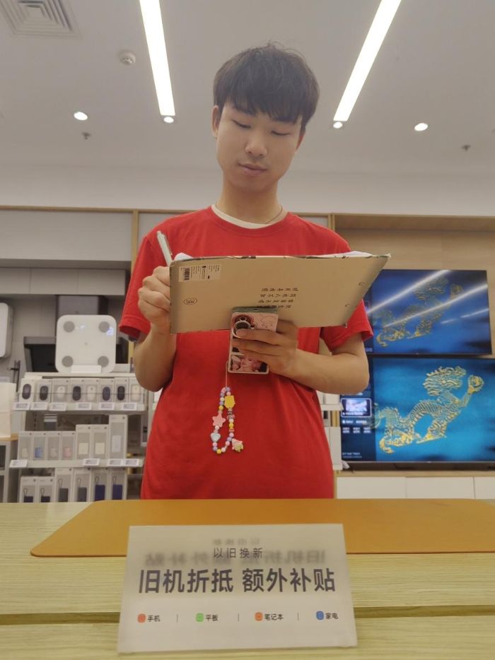 通過和廠家銷售人員的交流互動,團隊成員了解到:電子數碼產品店基本都有實行“以舊換新”政策,并大部分都在店內設立了立牌加以宣傳。當隊員們提及政策的效益如何時,有店家笑稱,店里面的手機有將近三分之一都是通過以舊換新賣出去的。對于“以舊換新”政策的看法,店員稱,以舊換新不僅可以替買家省錢,提高新機購買意愿,而且可以提高廠家的銷量,是一舉兩得的實惠政策。