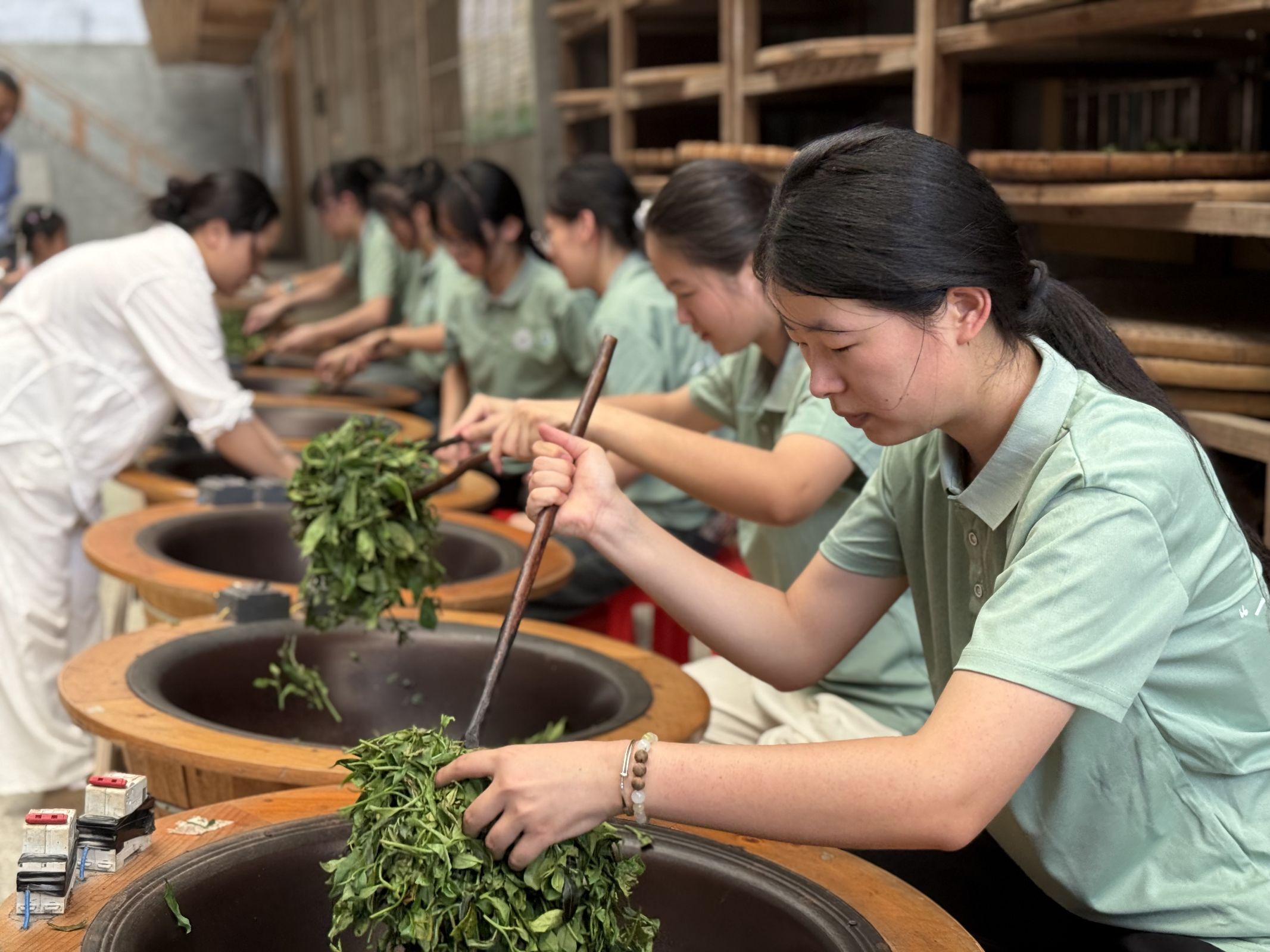 實踐團成員體驗了一系列完整的非遺制茶工藝:腰挎竹簍采擷一芽兩葉,指尖輕捻間感受茶樹生機;炒茶殺青,鐵鍋高溫淬煉鮮葉,跟著茶師練習“拋悶結合”手法;揉捻破壁,掌心壓力讓茶汁滲出,茶條漸顯“黑褐光澤”;經堆悶發酵的醇化、松柴明火的干燥,茶香漸濃。