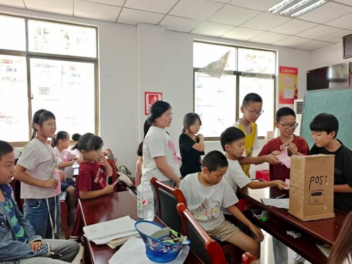 在“我的祖國(guó)我奉獻(xiàn)”活動(dòng)中,伴隨著《每一個(gè)你》的歌聲,實(shí)踐團(tuán)成員講述中國(guó)志愿者的故事,孩子們聽(tīng)得十分專注,隨后伏案寫(xiě)下自己對(duì)“奉獻(xiàn)”的理解,又親手繪制祝福卡片,將純粹的善意悄悄傳遞給中國(guó)志愿者。“薪火傳九州,同拼中國(guó)夢(mèng)”環(huán)節(jié)中,孩子們積極參與,課堂氛圍始終活躍。省份接龍時(shí),孩子們爭(zhēng)相回答,用充滿童趣的聯(lián)想記住一個(gè)個(gè)地名。鋪開(kāi)中國(guó)地圖拼圖,大家圍在一起協(xié)作,仔細(xì)比對(duì)每一塊拼圖的位置,當(dāng)完整的版圖在眼前展現(xiàn)時(shí),稚嫩的驚嘆聲中滿是對(duì)祖國(guó)疆域的好奇與熱愛(ài)。與此同時(shí),“知心姐姐的魔法信箱”靜靜地立在角落,悄悄收納著孩子們的小煩惱,又遞出帶著暖意的回信。