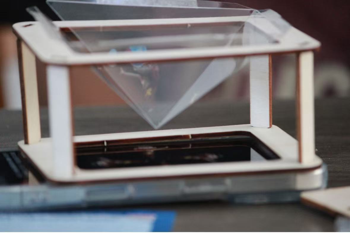 “不用戴3D眼鏡,也能看到立體的圖像!”全息投影演示區(qū)吸引了眾人目光。隊(duì)員展示了一個(gè)由透明塑料板組成的金字塔形教具,當(dāng)手機(jī)播放特制視頻并放在金字塔底部時(shí),金字塔頂端竟呈現(xiàn)出懸浮的立體影像——轉(zhuǎn)動(dòng)角度,能看到影像的不同側(cè)面。