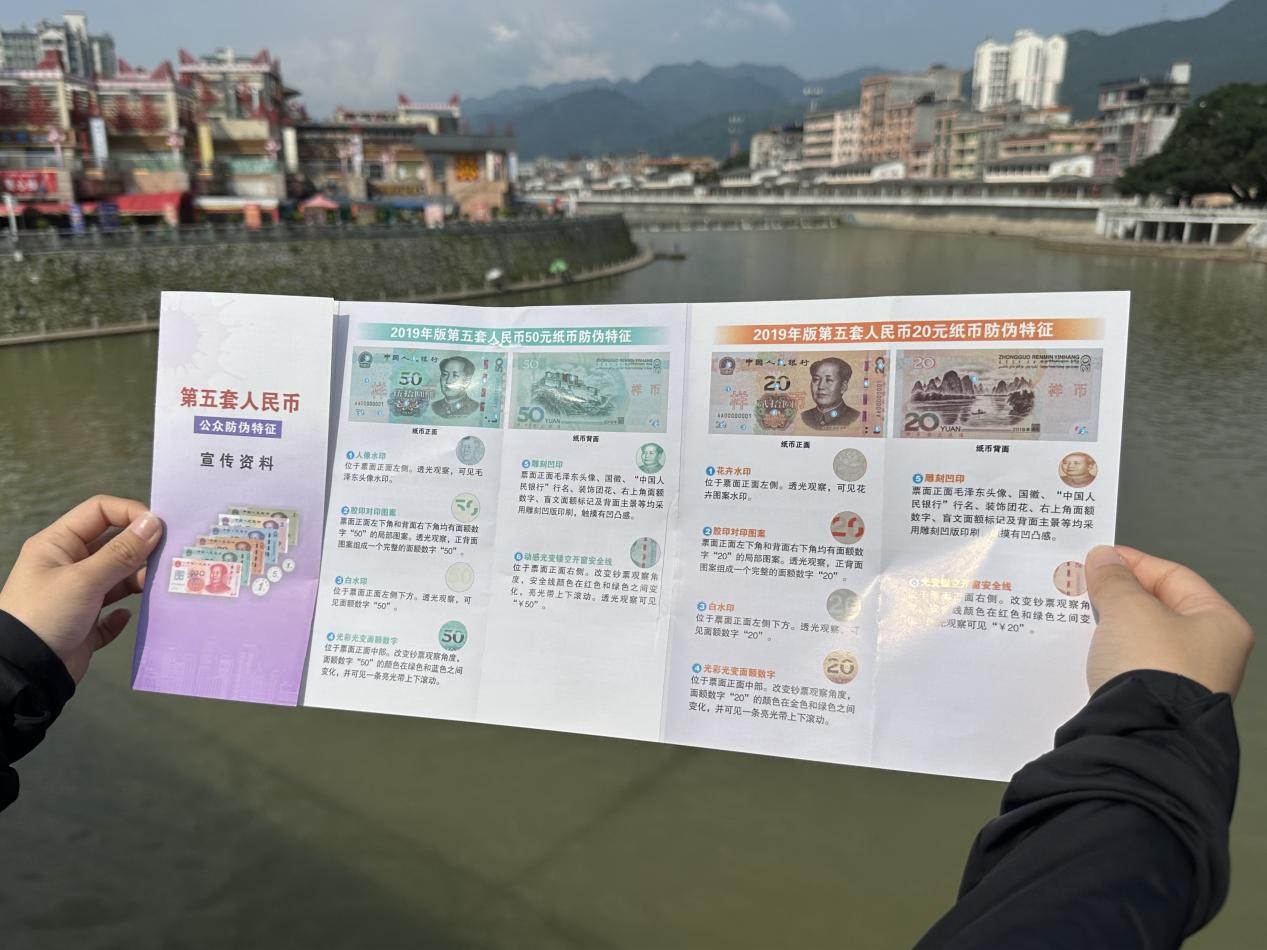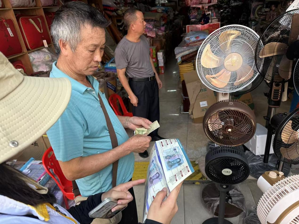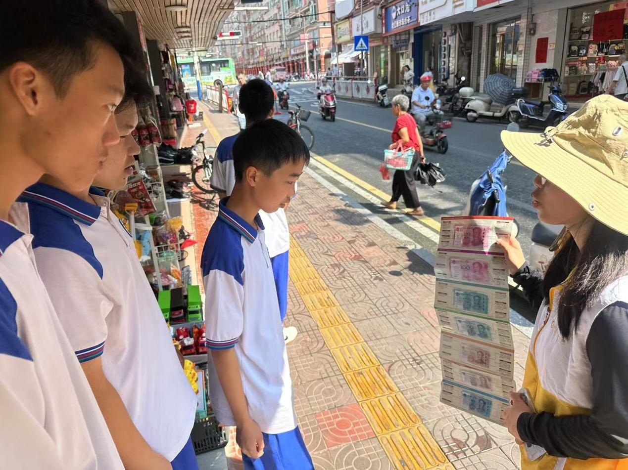 活動現場,最引人注目的當屬新穎的“新版人民幣知識”宣傳環節,吸引了眾多村民的關注。隊員們手持新版人民幣,通過實物展示和詳細講解,向村民們介紹人民幣的防偽特征。“大家看,這個數字在不同角度下顏色會發生變化,這就是重要的防偽標識之一。”隊員一邊演示,一邊耐心解說,向村民們介紹了新版人民幣的特征和防偽要點。他們拿出真鈔,結合宣傳手冊,詳細地為村民們指出人民幣上的防偽標識,如光彩光變數字、安全線等。一位參與活動的阿婆感慨道:“以前總是擔心收到假錢,這下聽了你們的講解,心里踏實多了!”“平時收到錢都不太敢確定真假,這下學了知識,以后就放心多了。”一位老板笑著說道。這種面對面、手把手的教學方式,讓村民們能夠直觀地學習到實用的金融知識,有效增強了他們在日常生活中識別假幣的能力。