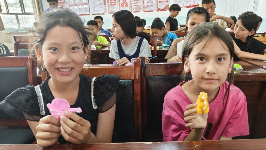 孩子們化身為“小小古生物復原師”,或專注地揉捏,或與同伴熱烈討論。實踐團隊的志愿者們則穿梭在課桌之間,耐心指導孩子們如何配色、塑形,解答他們五花八門的問題。一名叫阿迪力的男孩高高舉起他制作的綠色馬門溪龍,興奮地分享道:“我知道它的脖子最長,所以我特意把脖子捏得很長!”這一環節不僅鍛煉了孩子們的動手能力,更在無形中鞏固了科學知識,整個報告廳充滿了探索與創造的樂趣。