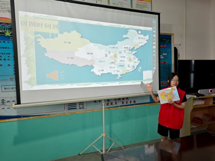 課堂上,實踐隊隊員袁亞雪老師從孩子們熟悉的生活環(huán)境切入,以“大家知道我們克度鎮(zhèn)在祖國的哪個‘小方塊’里嗎?”為話題,引發(fā)互動。隨后,借助色彩鮮艷、標注清晰的行政區(qū)地圖,將抽象的地理知識具象化,帶領孩子們先找到貴州,最終鎖定在孩子們的家鄉(xiāng)——平塘縣,再延伸至周邊省份,逐步梳理中國34個省級行政區(qū)“大公雞”版圖的輪廓與分布,課堂上此起彼伏的“我找到啦!”聲,迅速點燃學習熱情。