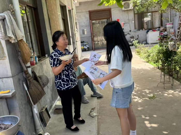 在盧五橋村、牛東村,實踐團成員懷揣調研問卷,傾聽村民對文化生活的期待,將美育的種子播撒在交談與笑語之間。指導教師與村干部圍桌暢談,聚焦“黨建+美育”模式在社區治理中的應用。村干部詳細介紹了村里在黨建引領下,通過文化活動增強村民凝聚力、提升社區文化氛圍的實踐與挑戰。雙方還就“一老一小”的美育需求進行了深入探討,為實踐團的調研指明了方向。同時,實踐團依托陜西職業技術學院中醫藥文創設計省級技能大師工作室的優勢,為老人們準備了“藝暖銀齡·安康相伴”宣傳彩頁,普及健康養生知識。隊員們用通俗易懂的語言,為老人們講解日常飲食、運動鍛煉、心理健康等方面的知識,贏得了老人們的稱贊與感謝。