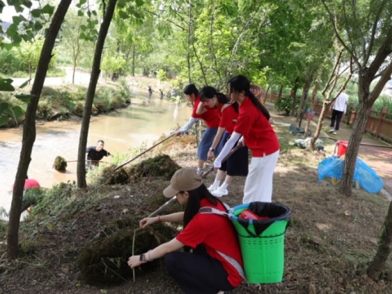 五、躬身共護碧水岸 攜手共筑鄉村美 一網撈起浮萍,掃帚拂去塵埃。近年來,齊躍橋村持續推進人居環境整治,通過“積分制”等激勵機制,鼓勵村民參與環境保護。實踐團一行也積極加入當地“積分制”志愿服務活動中,通過河道清理、道路清掃等實際行動,助力鄉村環境改善,推動生態與鄉風文明建設。在河道清理現場,成員們手持工具,仔細打撈漂浮物,清除雜草;在村道兩旁,大家分工協作,對生活垃圾進行集中清掃。