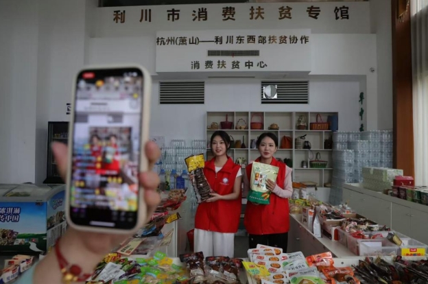 為拓寬農產品銷路,實踐團成員王佳怡、張悅悅走進錦繡山莊消費扶貧專館,與商戶林曉婭攜手開展助農直播。“大家看這個豆干,采用傳統工藝制作,嚼勁十足,豆香濃郁,絕對是健康零食的首選!”王佳怡熱情地向直播間觀眾介紹道。通過生動講解和現場展示,醇厚的利川紅茶、鮮香的柏楊豆干等特色農產品吸引了大量網友關注。實踐團直播不僅帶來了流量,更帶來了新的思路,用青春與智慧為鄉村產業發展添磚加瓦。