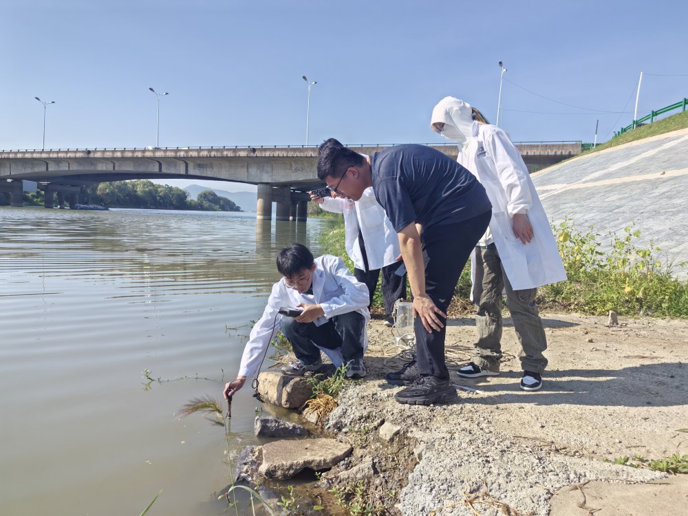 (圖為老師在指導(dǎo)學(xué)生如何進(jìn)行河流水質(zhì)監(jiān)測。 王煦然 供圖)