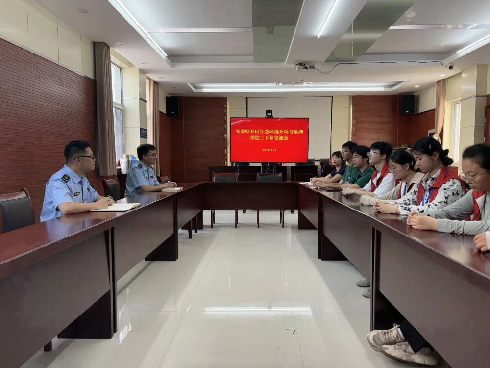 (圖為指導(dǎo)老師帶隊與安巢經(jīng)開區(qū)生態(tài)環(huán)境分局工作人員交流巢湖環(huán)境問題。王煦然 供圖)