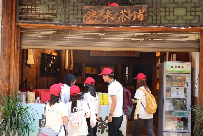 實(shí)踐隊(duì)穿梭于古城的街巷之中,用心感受著每一處歷史的痕跡,全面了解目前景區(qū)的運(yùn)行狀況。貞豐古城不僅有著深厚的歷史文化底蘊(yùn),還通過創(chuàng)新性保護(hù)與活化利用,將傳統(tǒng)文化與現(xiàn)代旅游完美融合。景區(qū)圍繞“吃住行娛游購”旅游要素,形成了特色餐飲區(qū)、非遺文創(chuàng)街、民俗展演區(qū)等多樣的業(yè)態(tài),以滿足游客多樣化的需求。這里的經(jīng)驗(yàn)與智慧,或許就是對門山村茶旅融合發(fā)展的關(guān)鍵鑰匙。