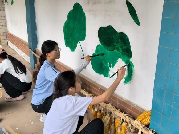 活動(dòng)中,隊(duì)員們分工協(xié)作,從構(gòu)圖、勾線到上色,每個(gè)環(huán)節(jié)都一絲不茍。有的隊(duì)員專注于勾勒稻田、龍眼、荔枝等產(chǎn)業(yè)振興元素,用飽滿的色彩展現(xiàn)鄉(xiāng)村產(chǎn)業(yè)蓬勃發(fā)展的活力;有的將綠水青山、整潔庭院描繪的栩栩如生,生動(dòng)詮釋了生態(tài)振興;還有的描繪了黨員干部勞作摘龍眼的美好畫面,彰顯基層組織的行動(dòng)力。烈日下,隊(duì)員們汗如雨下,但從未停下手中的畫筆,認(rèn)真專注的摸樣以及出色的墻繪成果吸引了不少過路的村民。