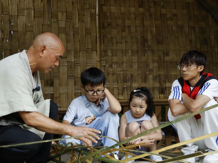 圖為肖云發師傅教小朋友編織竹籠 郭詩語攝