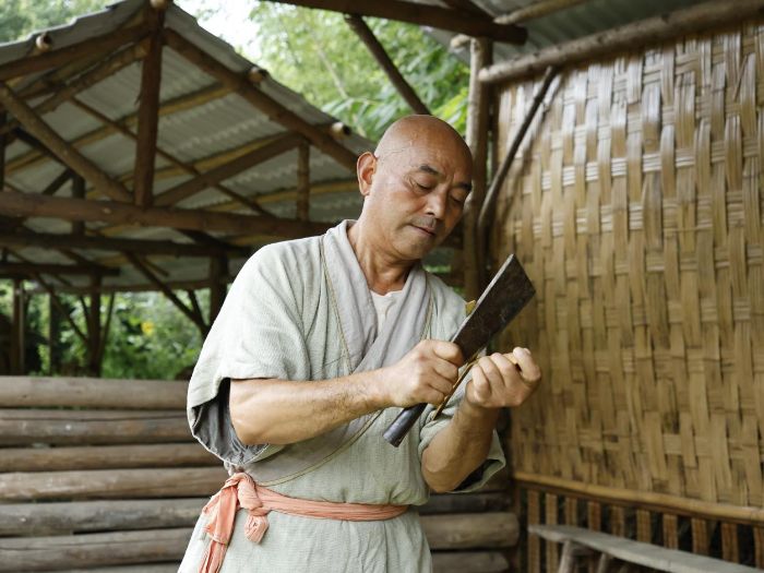 圖為肖云發師傅對竹條刨片 郭詩語攝