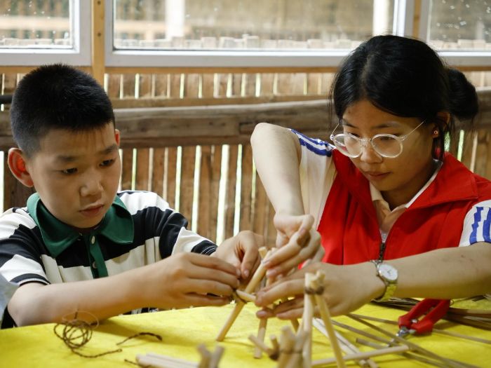 教學結束后,隊員們協助小朋友動手實踐。在編制竹籠的過程中,孩子們選取篾條,嘗試編織。他們在穿篾、繞結和扣合的反復練習中,逐步掌握基礎手法。雖然一開始動作稍顯生疏,但在志愿者的鼓勵和幫助下,孩子們手中的竹籠逐漸成型。搭建榪槎時,孩子們分工協作且配合默契,從中他們不僅學會了如何運用所學知識進行實際操作,更深刻體會到團隊協作的重要性。