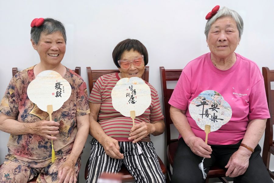 02圖為奶奶們拿著自己做的漆扇拍照。朱靜雯供圖