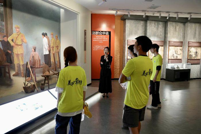 團隊成員走進南湖革命紀念館,映入眼簾的56根檐柱,隱喻56個民族緊密團結在黨中央周圍成為視覺起點,從鄧恩銘(水族)的革命經歷到新時代扶貧,實證“中華民族共同奮斗史”,在“光輝歷程”展廳,看到了“習近平總書記考察湘西十八洞村”和“加快民族地區發展”等現代板塊,展現了脫貧攻堅與民族地區發展的偉大成就。團隊成員在泛黃的歷史文獻與珍貴的革命文物間追溯黨的初心,讓紅色基因在青年心田深深扎根。