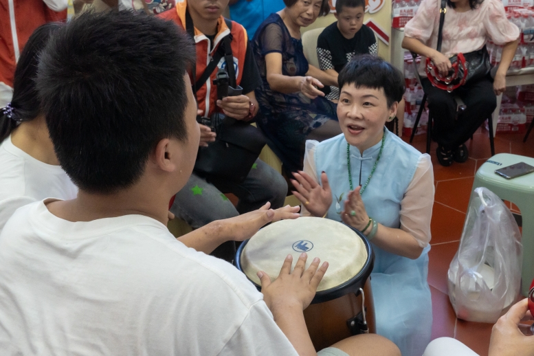 香薰DIY現(xiàn)場(chǎng),隊(duì)員們提前備好精油、干花等材料并協(xié)助分發(fā)。家長(zhǎng)們?cè)诓栊喟橹袑W?chuàng)作,在親手制作香薰的過程中放松身心,不少家長(zhǎng)表示“難得有這樣的閑暇時(shí)刻,感覺壓力減輕了不少”。而在心靈課堂上,國(guó)家二級(jí)心理咨詢師連麗雙老師借助鼓樂開展療愈教學(xué),“兩叩兩擊”的節(jié)奏讓家長(zhǎng)與孩子在聽覺互動(dòng)和身體律動(dòng)中獲得放松,同時(shí)為“星孩”提供了針對(duì)性的感官訓(xùn)練。