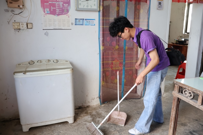 抵達(dá)九龍村后,在九龍村黨委副書記吳獻(xiàn)民的帶領(lǐng)下來到了五保戶爺爺家。推開略顯陳舊的大門,映入眼簾的是略顯雜亂的庭院和有些破舊的房屋。爺爺年事已高,獨(dú)自生活,家中的衛(wèi)生狀況不容樂觀。看到大家的到來,爺爺臉上露出了驚喜的笑容,熱情招呼。簡單的寒暄后,大家便開始分工行動(dòng)。有的同學(xué)拿起掃帚,清掃庭院和屋內(nèi)的灰塵與雜物;有的同學(xué)提著水桶,擦拭桌椅、門窗;有的為爺爺更換了干凈的床單、被褥,仔細(xì)地鋪好床鋪。