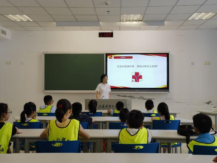 在文理大樓106教室,志愿者向孩子們介紹江蘇科技大學(xué)情況,圖文并茂講解學(xué)校“船舶、海洋、蠶桑”三大辦學(xué)特色,并以“架語言之橋,傳博愛之光”為主題,講述紅十字會(huì)起源與精神內(nèi)涵,教授中英急救實(shí)用對(duì)話,科普中暑、燒傷、海姆立克急救法等急救知識(shí)。“誰來試試海姆立克急救法的手勢(shì)?”孩子們爭(zhēng)相舉手,志愿者耐心示范,通過親身實(shí)踐,孩子們不僅掌握了急救技巧,還深刻理解了紅十字精神。