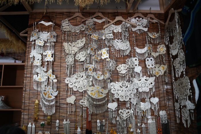 店鋪臨街區域,左右兩排著衣模特整齊陳列,后排貨架上層層疊疊掛滿風格各異的彝繡服裝;再往里走,則是琳瑯滿目的耳飾、頭飾等飾品區。