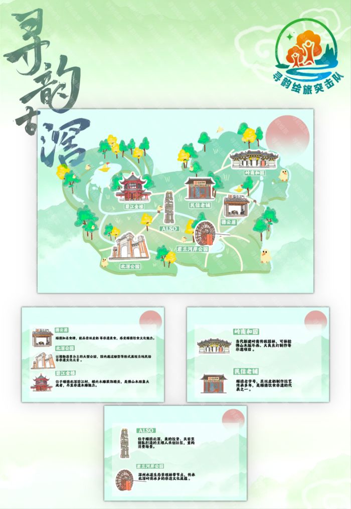 同時,團隊繪制“尋韻古滘”景點地圖,以石獅子為靈感基底,參照北滘地圖形狀設計,將碧江金樓、嶺南和園、北滘公園等文旅地標串聯成趣游線路。石獅子作為傳統文化符號,承載守護與傳承之意,與地圖探尋北滘歷史文化韻味的主題深度契合,讓游客在漫步中感受到千年水鄉的文化脈絡。