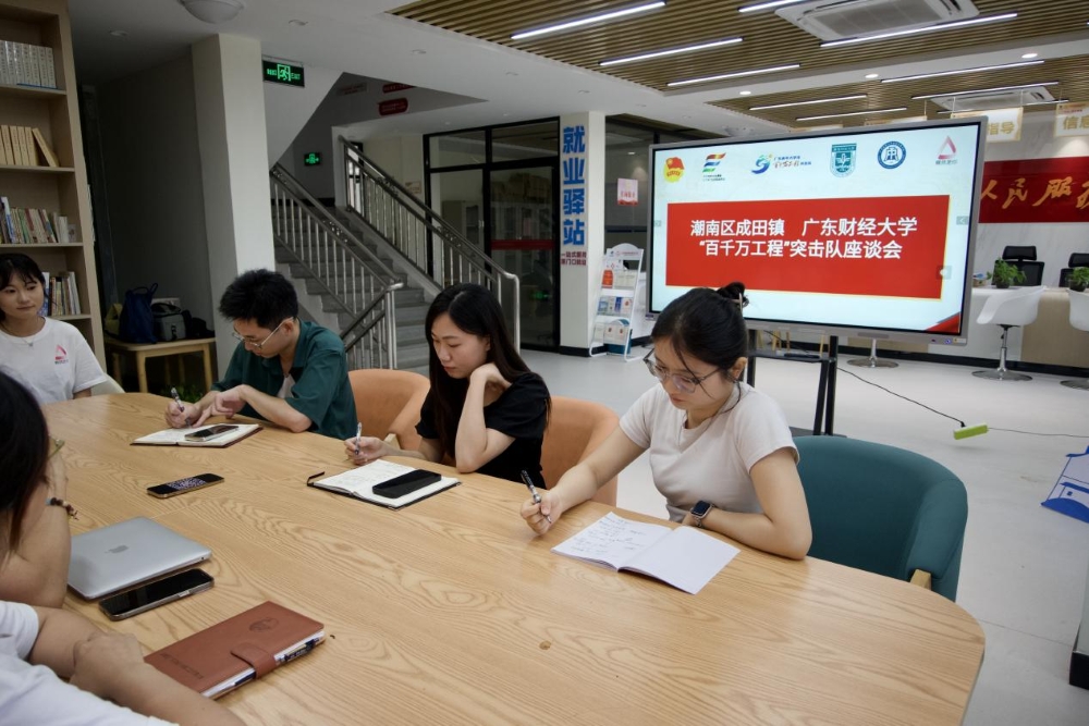 沿途的田園風光與錯落有致的潮汕民居相映成趣,古樸的村落風貌與鮮活的文化傳承共同勾勒出成田獨有的人文風情,讓大家流連忘返、贊嘆不已。如何讓這份藏于鄉野的文化魅力被更多人看見?帶著對成田鎮宣傳推廣的深層思考,實踐團與成田鎮團委開展座談會。會上成田鎮團委書記唐岸晞向實踐團系統介紹了成田鎮獨特的文化基因:從屋脊上綻放千年的大寮嵌瓷,到承載故鄉記憶的非遺粿品,從 “中國電影之父” 鄭正秋的光影傳奇,到僑鄉美麗鄉村治理、文化交融的歷史印記,全面展現了成田鎮在文化傳承與文旅發展中的特色與潛力。