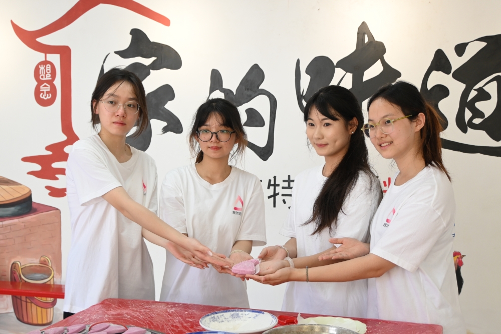 東鹽村以“粿”文化為切入點,“東鹽水鄉、佰粿飄香”為主題,以產業發展為導向,通過融入動漫元素,設計吉祥物“喜桃”,塑造“我愛東鹽”IP,在粿品工坊的基礎上,村里陸續開設露天茶座、故然居・粿舍,為游客提供多樣化的體驗,逐步形成以飲食文化、休閑度假和觀光旅游于一體的“粿”文化旅游村。在蒸汽氤氳的工坊里,經驗豐富的師傅們手指翻飛,將承載著家鄉味道的粿皮包裹上精心調制的餡料,伴隨著粿印輕巧的敲擊,一個個寓意吉祥的紅桃粿便如花般綻放。實踐團在非遺傳承人的指導下,體驗非遺粿文化制作,在揉捏粿皮、壓模成型的親身體驗中,感受潮汕飲食文化魅力。從記錄粿品模具的潮汕圖騰紋樣,到體驗 “紅桃粿”的制作工藝,實踐團制作推出《粿韻匠心:潮汕記憶中的手作紅桃粿》專題短片,讓這道承載著故鄉情懷的美食,成為連接傳統與當下的文化紐帶,讓更多人透過蒸騰的熱氣,讀懂潮汕飲食里的煙火溫情與文化密碼。