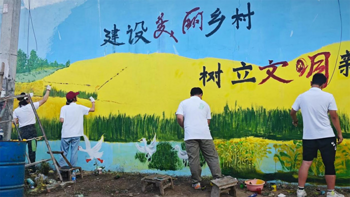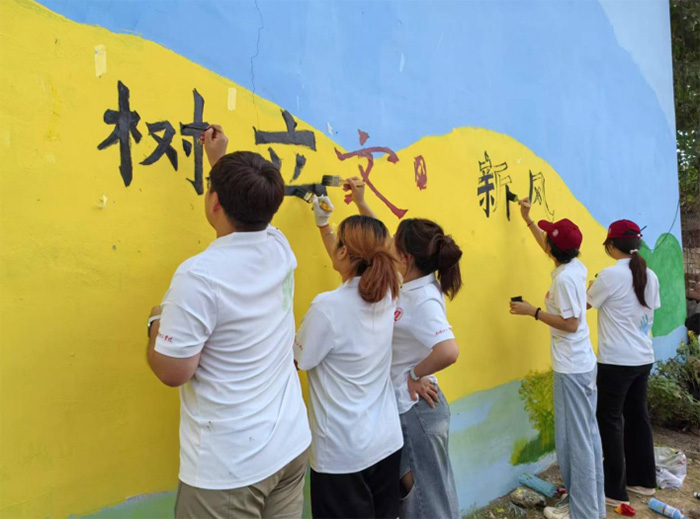 創作過程充滿挑戰。高溫下,顏料在墻體上快速凝結,汗水模糊了視線;一場突如其來的大雨,更將部分已完成的文字沖刷殆盡。面對挫折,師生們沒有退縮。他們擦干畫板上的雨水,重新調配顏料,爭分奪秒優化設計。夜幕降臨,燈光照亮專注的身影,畫筆在修復的墻面上堅定舞動,最終讓承載著文明鄉風與美好愿景的畫卷在村巷間完美呈現。