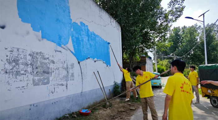 圖為實踐隊員補救大雨沖刷過的墻繪 李珂 供圖