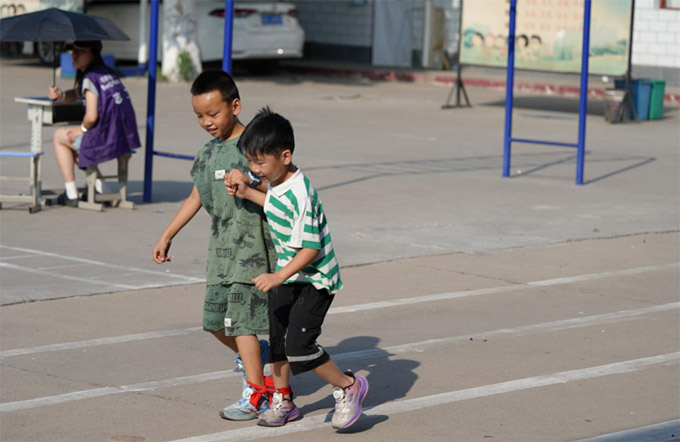 “兩人三足”比賽率先舉行。相鄰的兩個孩子,用布帶緊緊綁住內側的腳踝,從獨立的個體轉身變成了必須步伐劃一、協調整齊的“共同體”。哨聲一響,配合默契,“一二、一二”喊著號子,步伐穩健如一人,疾步沖向終點;略顯慌亂,步履蹣跚,不慎跌倒,踉踉蹌蹌挪到終點。但不管是順利還是磕絆,系完布帶彼此攙扶起身時相視一笑的會心鼓勵,緊握對方手臂傳遞的可靠力量,都“并肩同行”的超凡意義超越了競賽本身——那根綁帶,實現了孩子們的心心相連與相惜。