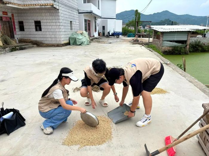 看到村民忙著收曬黃豆,隊員們立刻上前幫忙,一邊躲雨一邊笑著忙碌,那一刻,大家和這片土地的距離,悄悄被拉近了。