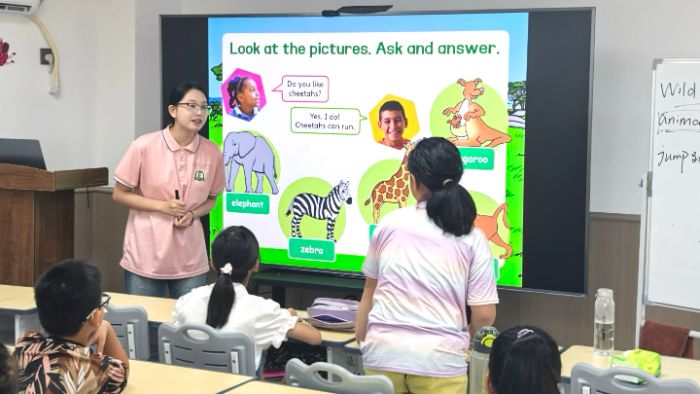 在英語繪本課堂上,實踐隊隊員遵循“聽故事、看畫面、玩游戲、開口說”四維學習模式,結合PPT,激發孩子的聽覺、視覺與語言表達潛能。以趣味小游戲為線,引導學生大膽表達所想、所感。孩子們從最初的青澀不敢開口,到沉浸于生動的故事場景與趣味互動中,在沉浸式體驗中建立英語思維。不僅讓孩子們擺脫機械背誦的壓力,還提高了孩子們英語口語表達能力。